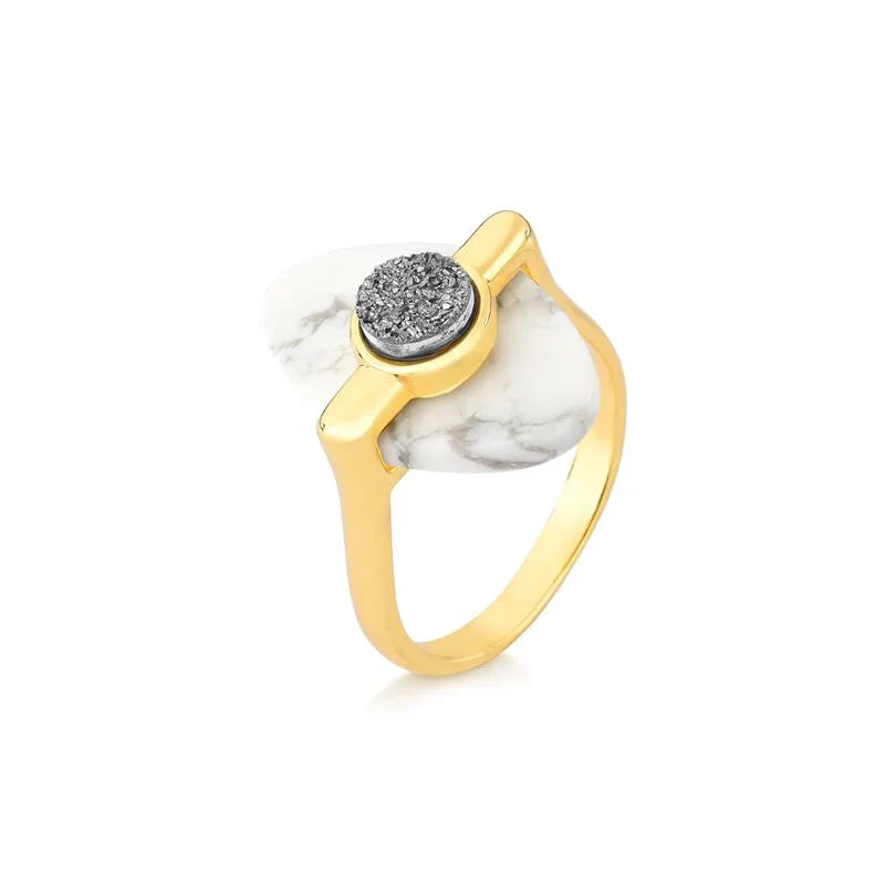 Erleben Sie Mut und Stil mit diesem vergoldeten Ring im modernen und markanten Design. Das organisch geformte Mittelstück ist mit einer strukturierten Edelsteineinlage verziert, die einen interessanten optischen Kontrast erzeugt. Perfekt für alle, die ein einzigartiges Accessoire suchen, das auffällt, verleiht dieser Ring jedem Look Persönlichkeit.