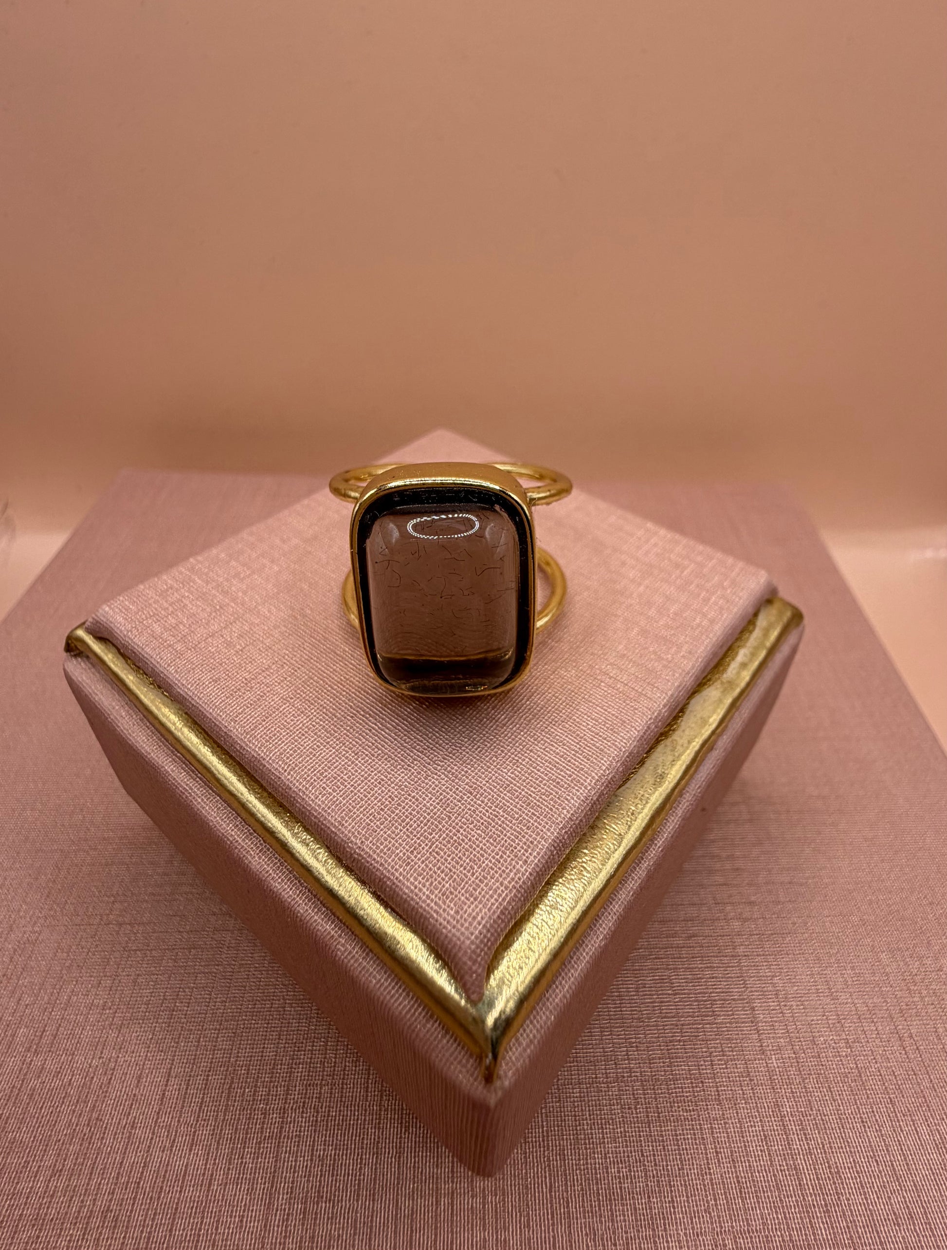 Dieser schillernde Ring besticht durch seinen rechteckigen Edelstein mit abgerundeten Kanten, der dem Design klassische und moderne Eleganz verleiht. Die vergoldete Struktur besticht durch ihre originelle, durchbrochene Form, die den Finger mit Leichtigkeit und Stil umhüllt. Er ist ein vielseitiges und raffiniertes Schmuckstück für jeden Anlass – ideal für alle, die ein Schmuckstück mit Präsenz und Charme suchen.