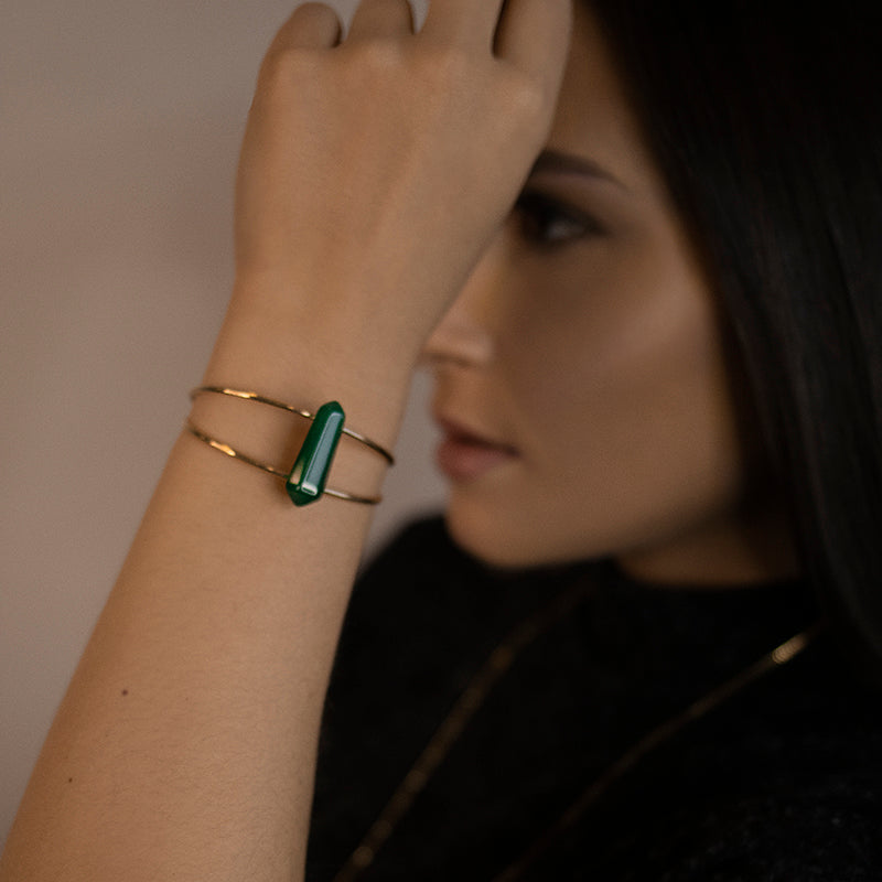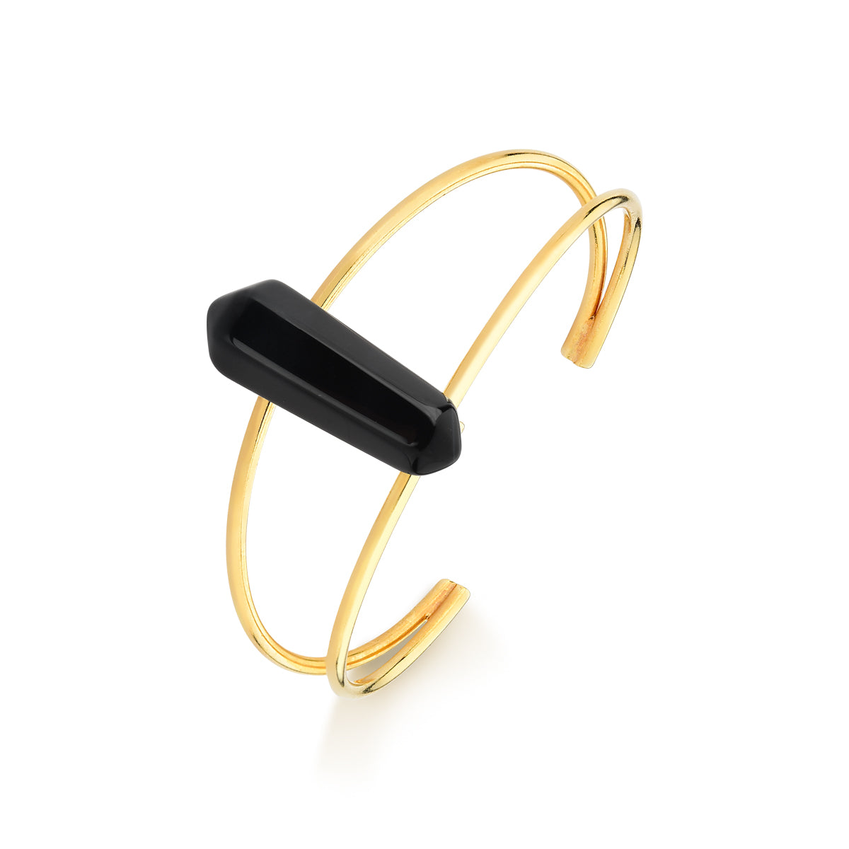 Ajoutez une touche d'élégance minimaliste à votre poignet avec ce bracelet plaqué or. Le design présente un double anneau ouvert, complété par une pierre centrale de forme allongée et taillée, qui confère un charme unique et sophistiqué. Parfait pour être porté seul ou en combinaison avec d'autres pièces, ce bracelet est un accessoire polyvalent qui s'adapte à toutes les occasions.