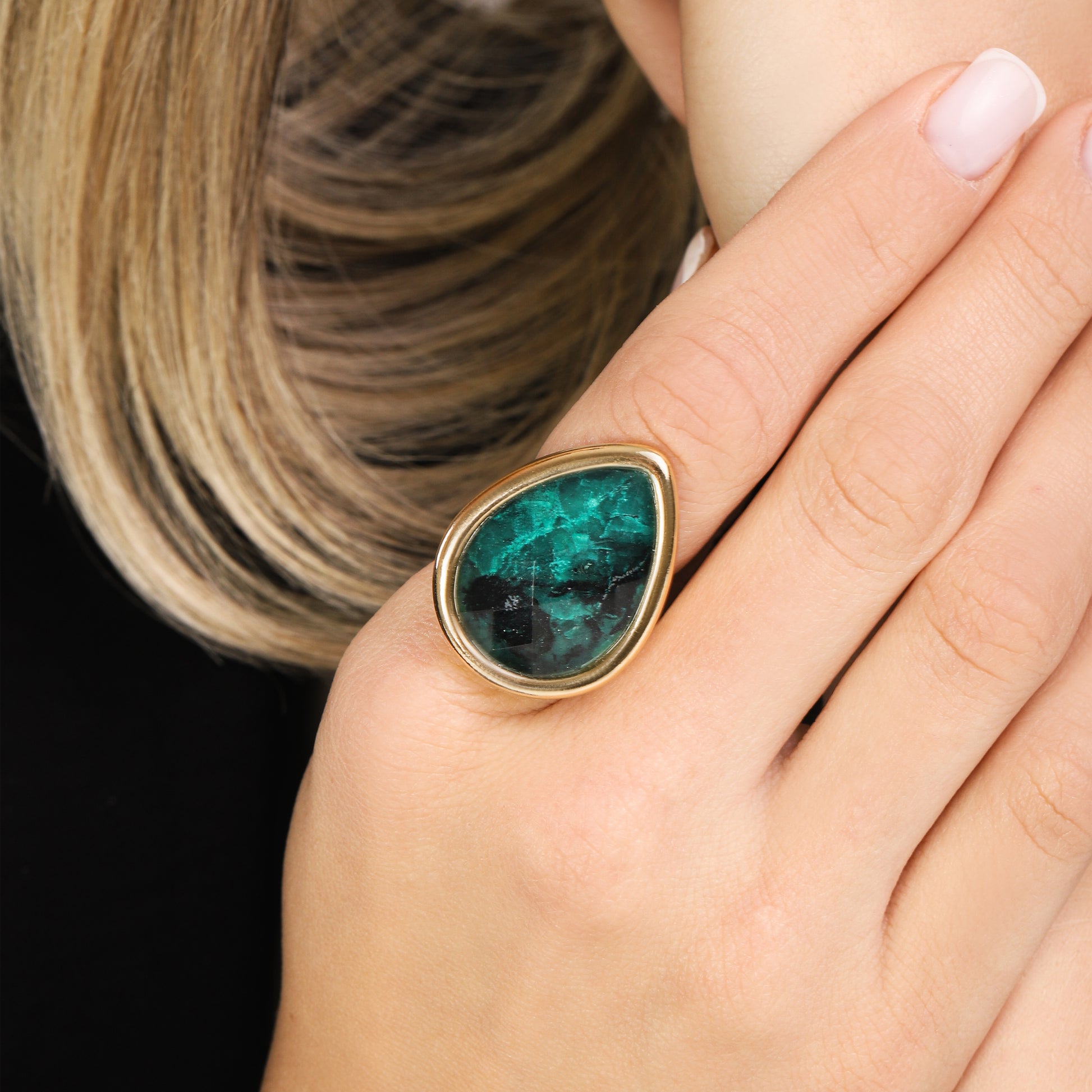 Découvrez l'élégance contemporaine avec cette bague éblouissante, qui associe l'éclat du plaqué or à une pierre taillée de manière organique et à une surface multifacette. La pierre centrale, de forme irrégulière et enveloppante, est soigneusement encadrée par un anneau robuste et poli, créant un contraste sophistiqué. Son design volumineux et sa finition lisse garantissent une présence remarquable et un confort exceptionnel. Une pièce polyvalente qui ajoute une touche d'art et de luxe à toute occasion.