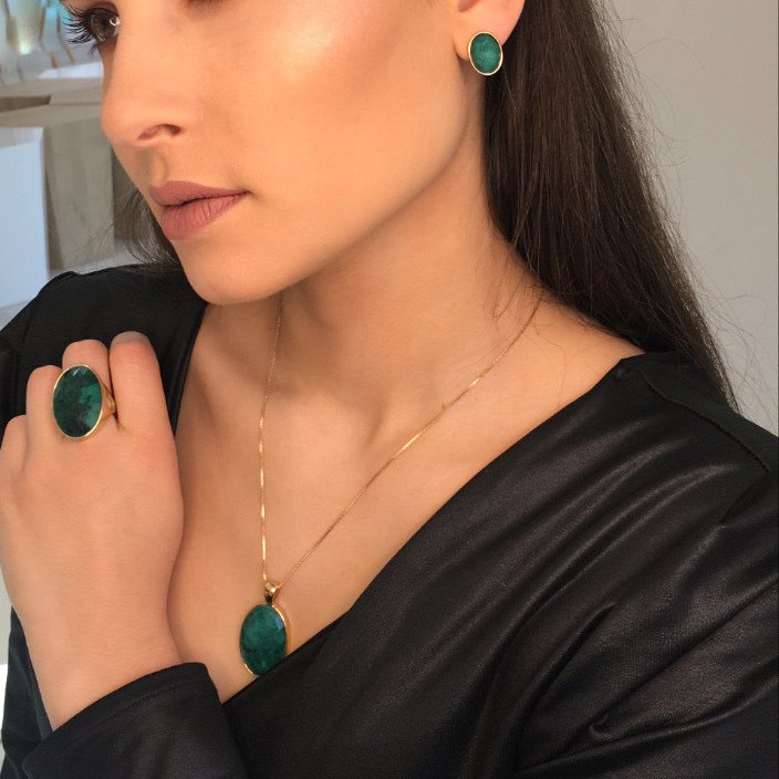 Ajoutez une dose de couleur et de personnalité à votre style avec cette bague moderne et vibrante. La pièce se distingue par sa grande pierre centrale de forme ovale, qui présente un éclat unique avec ses textures et ses veines naturelles. L'anneau large et poli, avec des détails ajourés, confère un air de sophistication et de légèreté, complétant parfaitement la pierre. Cette bague est le choix idéal pour ceux qui recherchent un accessoire alliant élégance et une touche d'audace.
