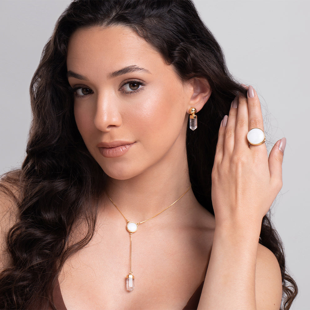 Un classique avec une touche de modernité. Cette paire de boucles d'oreilles longues allie l'élégance minimaliste d'une boule dorée à la beauté naturelle d'un pendentif en pointe de cristal. La base supérieure sphérique et lisse contraste avec la texture unique de la gemme, créant un look sophistiqué et polyvalent, parfait pour passer du jour à la nuit. La taille délicate du cristal met en valeur sa luminosité, reflétant la lumière de manière subtile et charmante.