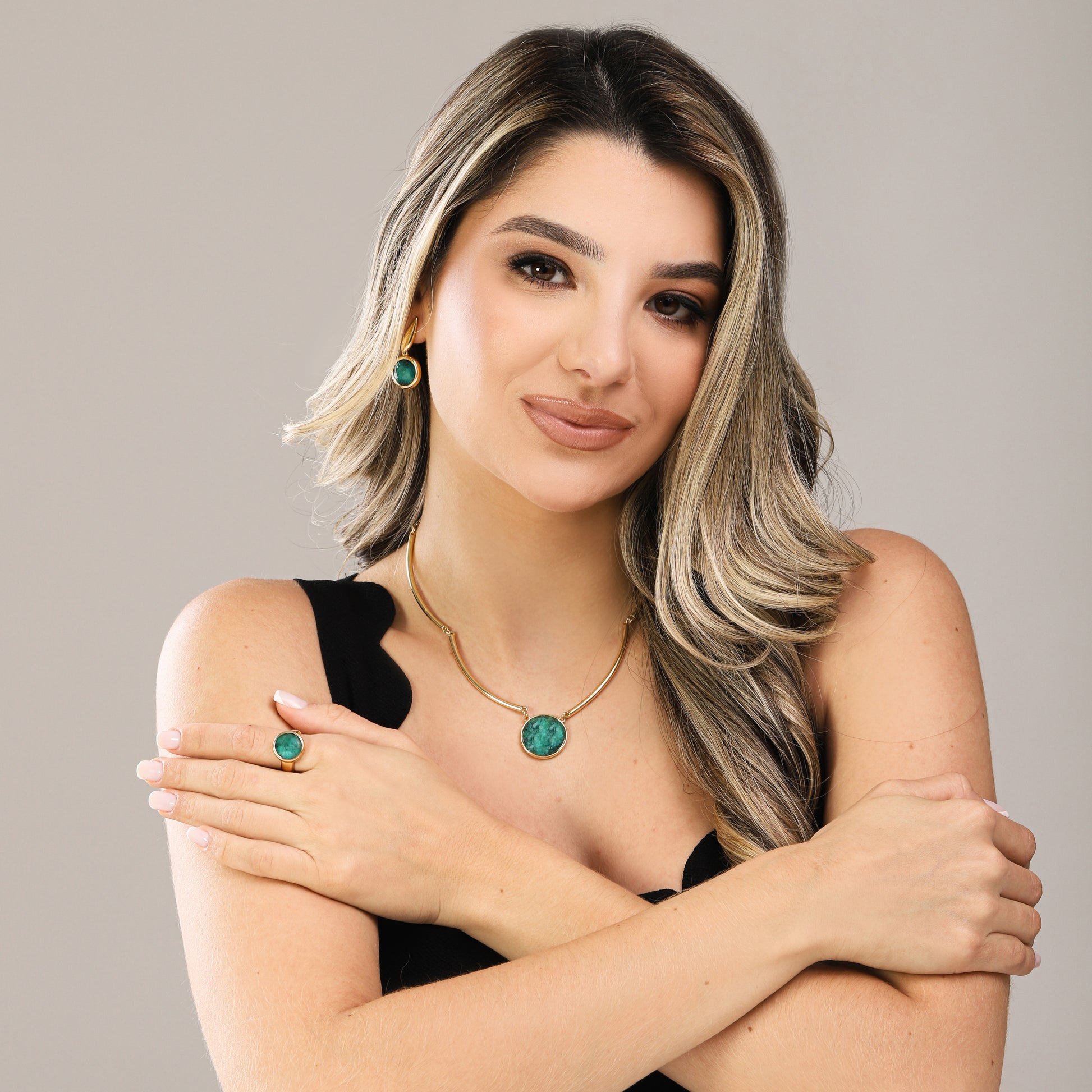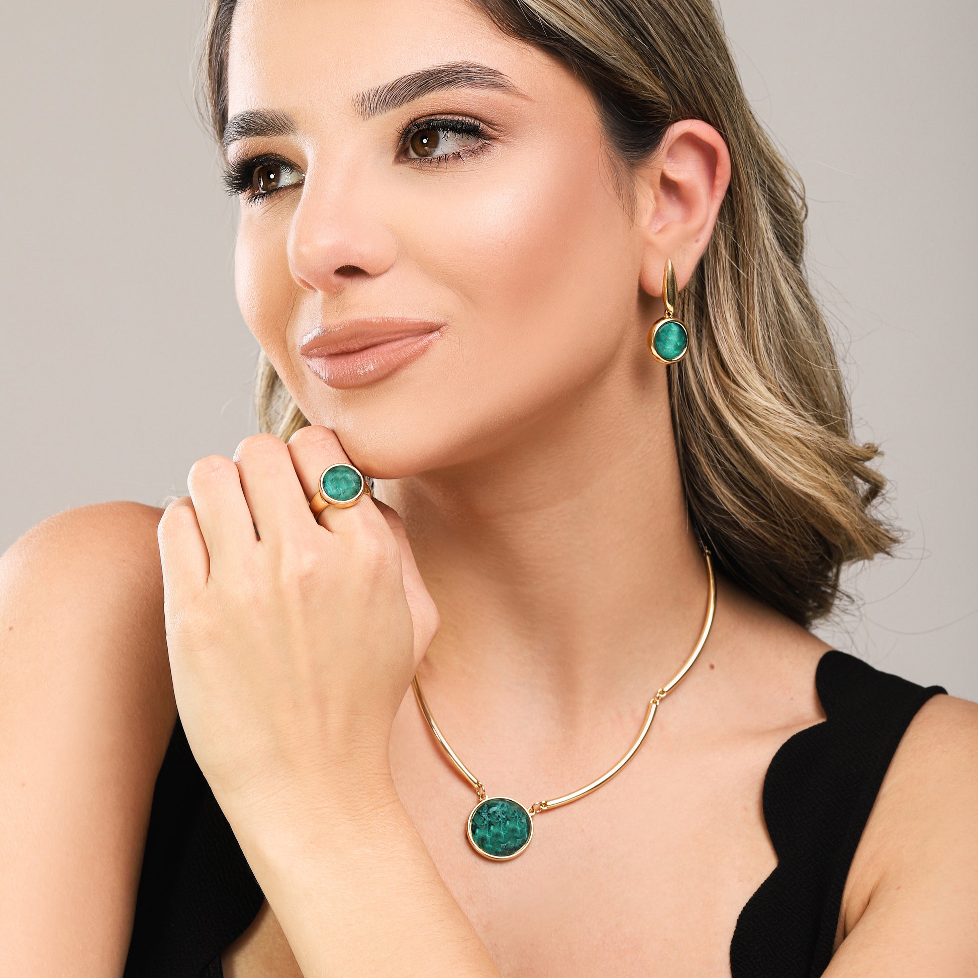 Ce collier plaqué or allie le minimalisme d'un anneau rigide à la délicatesse d'une pierre circulaire. La pierre, avec une taille à facettes qui met en valeur sa beauté, est le point focal de la pièce, suspendue de manière subtile au centre du collier. Le design semi-rigide assure une présence saisissante et moderne, tandis que la chaîne d'extension permet un ajustement parfait au cou. Une pièce maîtresse pour ajouter une touche d'élégance et de couleur à votre look.