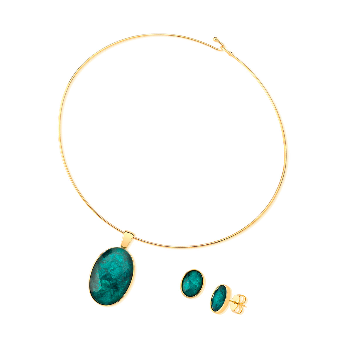 Découvrez l'élégance contemporaine avec cet ensemble éblouissant, qui allie le luxe du plaqué or à des pierres de design organique et à une surface multifacette. La pièce maîtresse, un collier avec un pendentif de forme ovale, est complétée par des boucles d'oreilles qui suivent le même motif, créant une harmonie parfaite. La chaîne vénitienne, fine et délicate, ajoute une touche de légèreté. Cet ensemble polyvalent est idéal pour apporter de la sophistication et une touche de couleur à n'importe quel look.