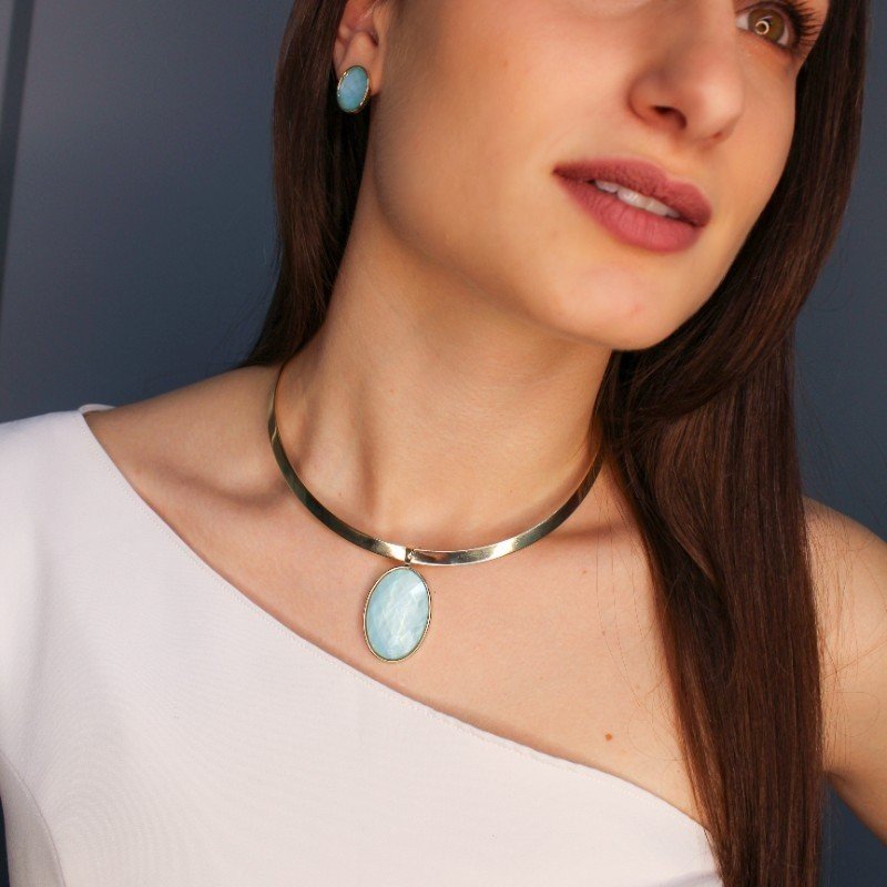 Cet ensemble respire l'élégance et la modernité. Le collier et les boucles d'oreilles présentent une pierre centrale en forme de goutte avec une taille à facettes qui reflète la lumière de manière éblouissante. Le pendentif du collier se connecte à une base ovale polie. Les boucles d'oreilles pendantes suivent le même design, créant une harmonie parfaite. La chaîne vénitienne, fine et délicate, complète le look avec légèreté. C'est un ensemble polyvalent et élégant pour ajouter une touche d'éclat à n'importe quel look, du décontracté au plus sophistiqué.