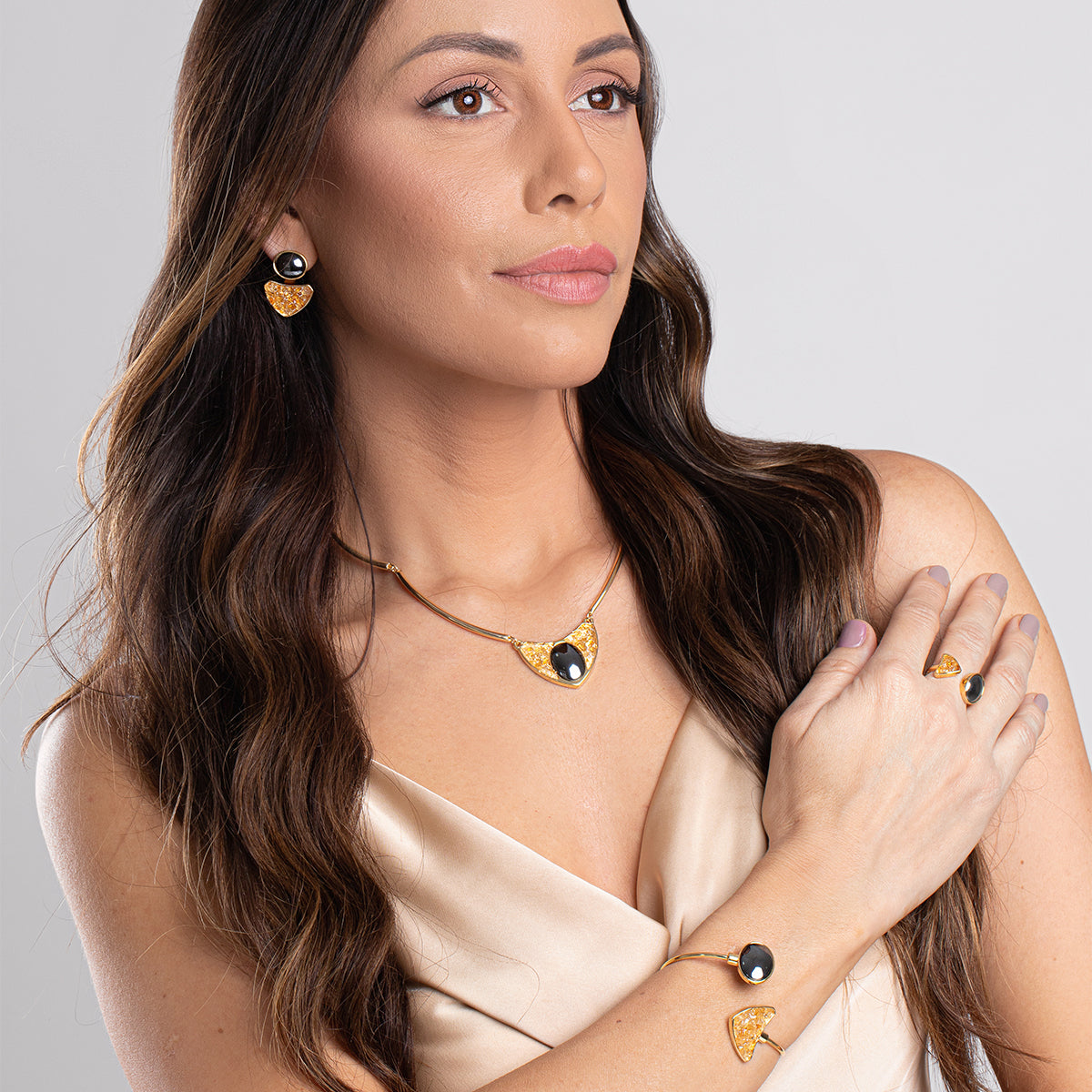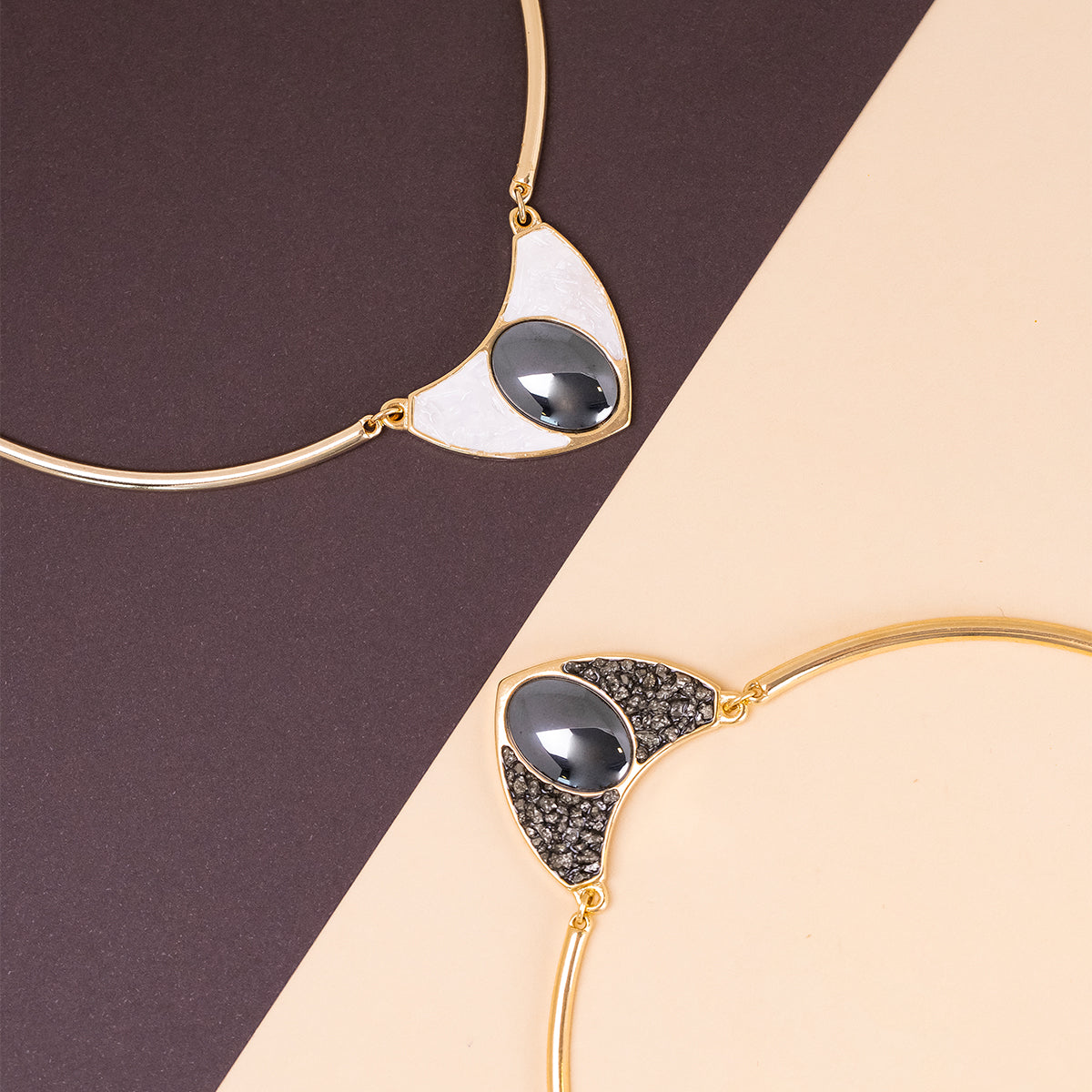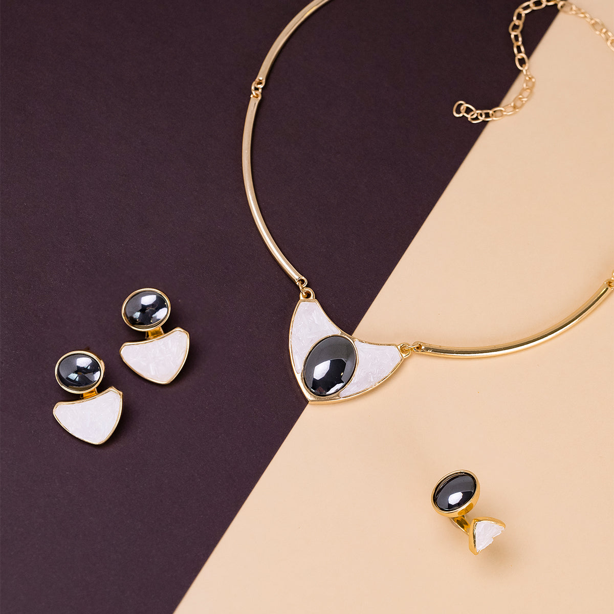 Rehaussez votre style avec cet ensemble plaqué or, qui respire la modernité et la sophistication. Le collier présente un design rigide et incurvé qui s'ajuste élégamment au cou, culminant en un pendentif central de forme géométrique, orné d'une pierre ovale lisse et d'une zone texturée avec des incrustations de pierres. Les boucles d'oreilles, suivant le même motif, combinent la pierre ovale et la texture granuleuse dans un design compact et stylé. Cet ensemble est parfait pour ceux qui recherchent un look contemporain et marquant, idéal pour diverses occasions, du décontracté au formel.