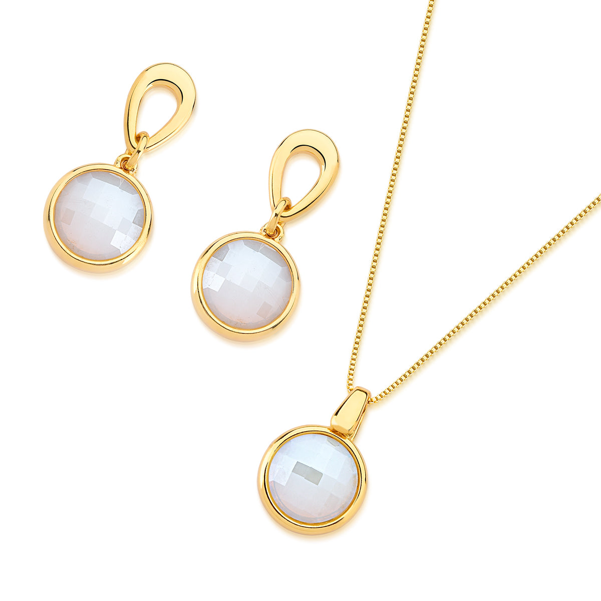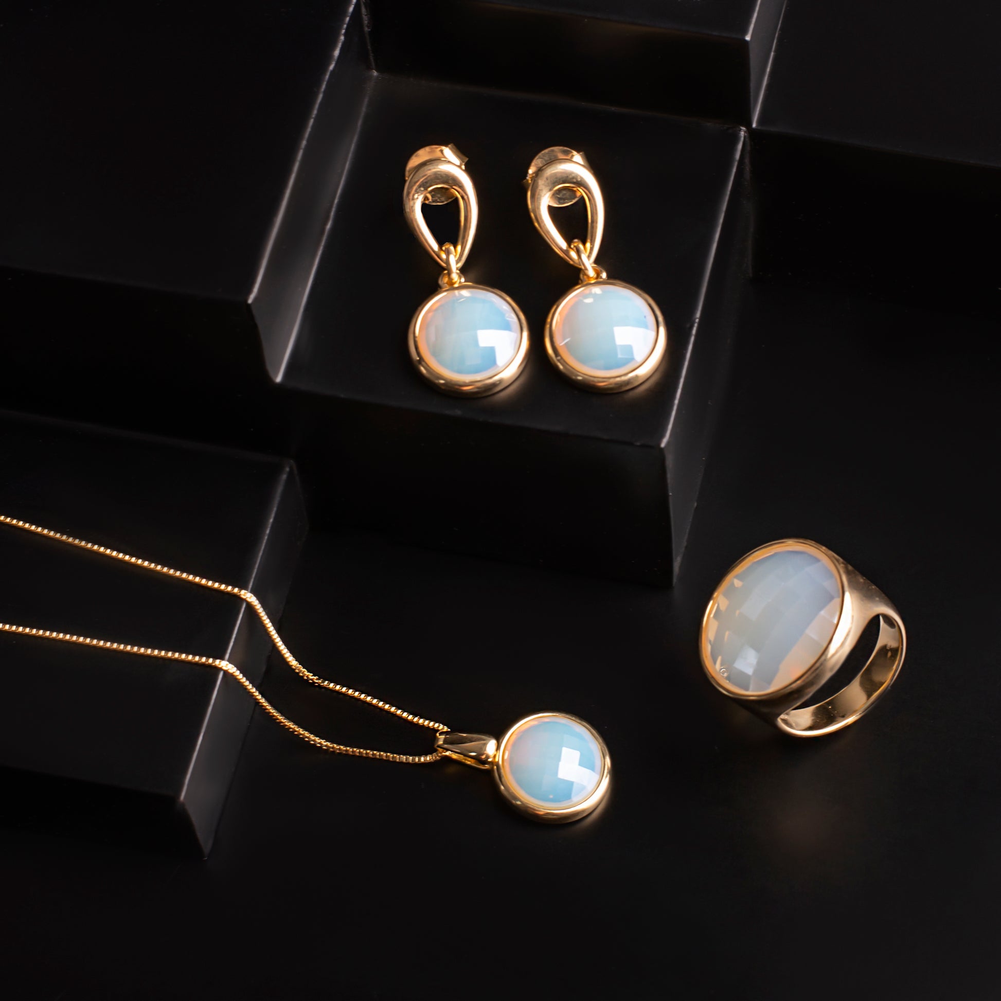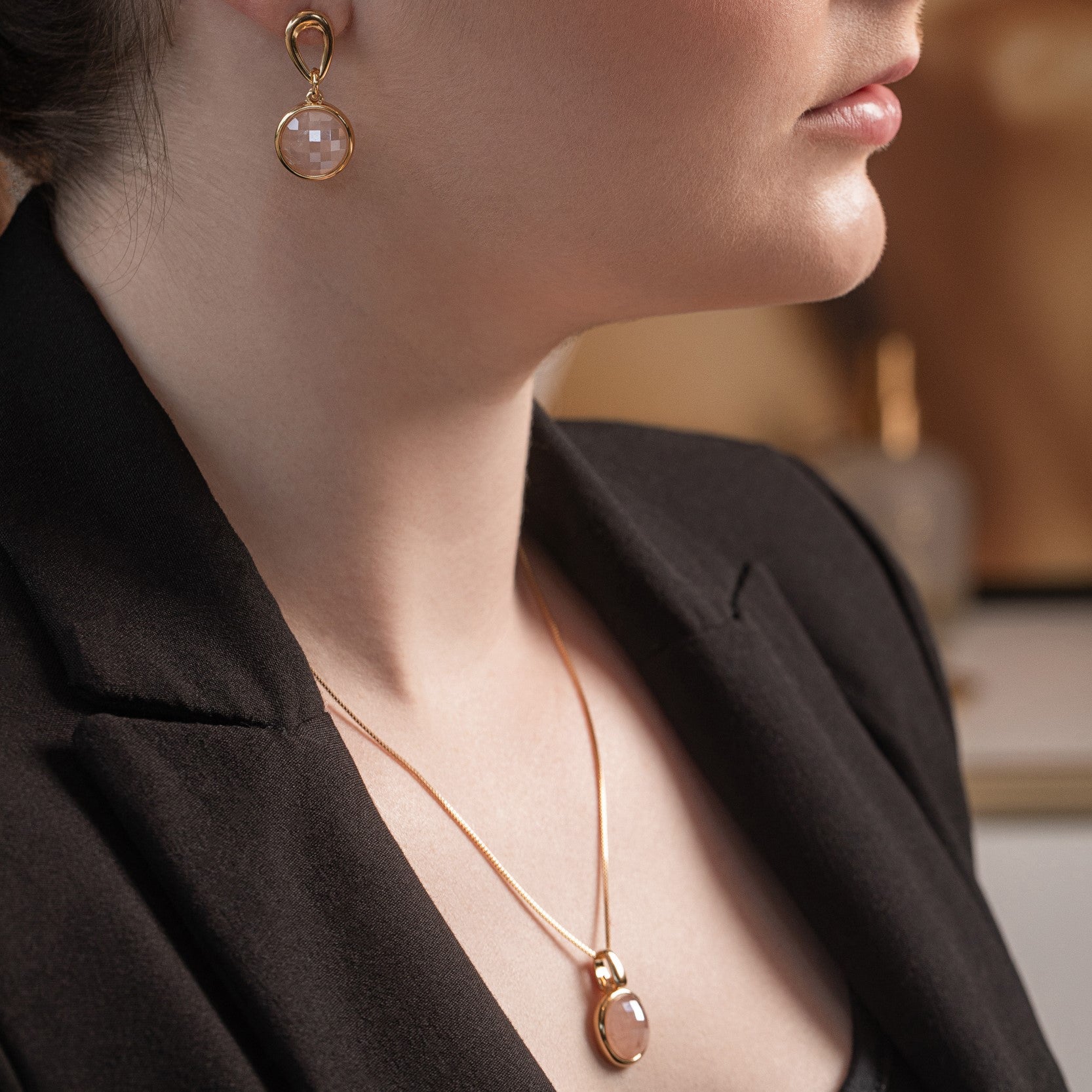 Ajoutez une touche de délicatesse et d'élégance à votre look avec cet ensemble polyvalent. Les boucles d'oreilles et le pendentif du collier présentent des pierres rondes, multifacettes et à l'éclat doux, suspendues à un maillon plaqué or. La chaîne fine et le design léger assurent un tombé parfait, idéal pour sublimer votre visage avec discrétion et sophistication. Cet ensemble est le choix parfait pour ceux qui recherchent un accessoire alliant beauté classique et touche moderne.