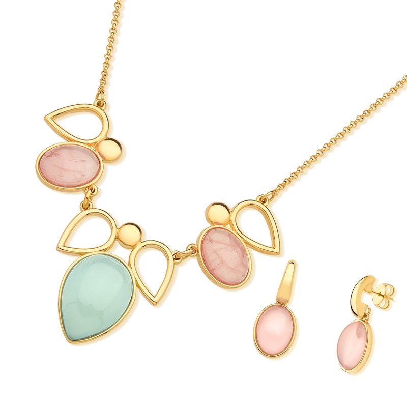 Cet ensemble sophistiqué plaqué or est composé d'un collier et de boucles d'oreilles, présentant un design vibrant et moderne. Le collier affiche une séquence de maillons organiques, intercalés avec des pierres aux tons rose et bleu clair, qui ajoutent une touche de couleur et de légèreté à la pièce.