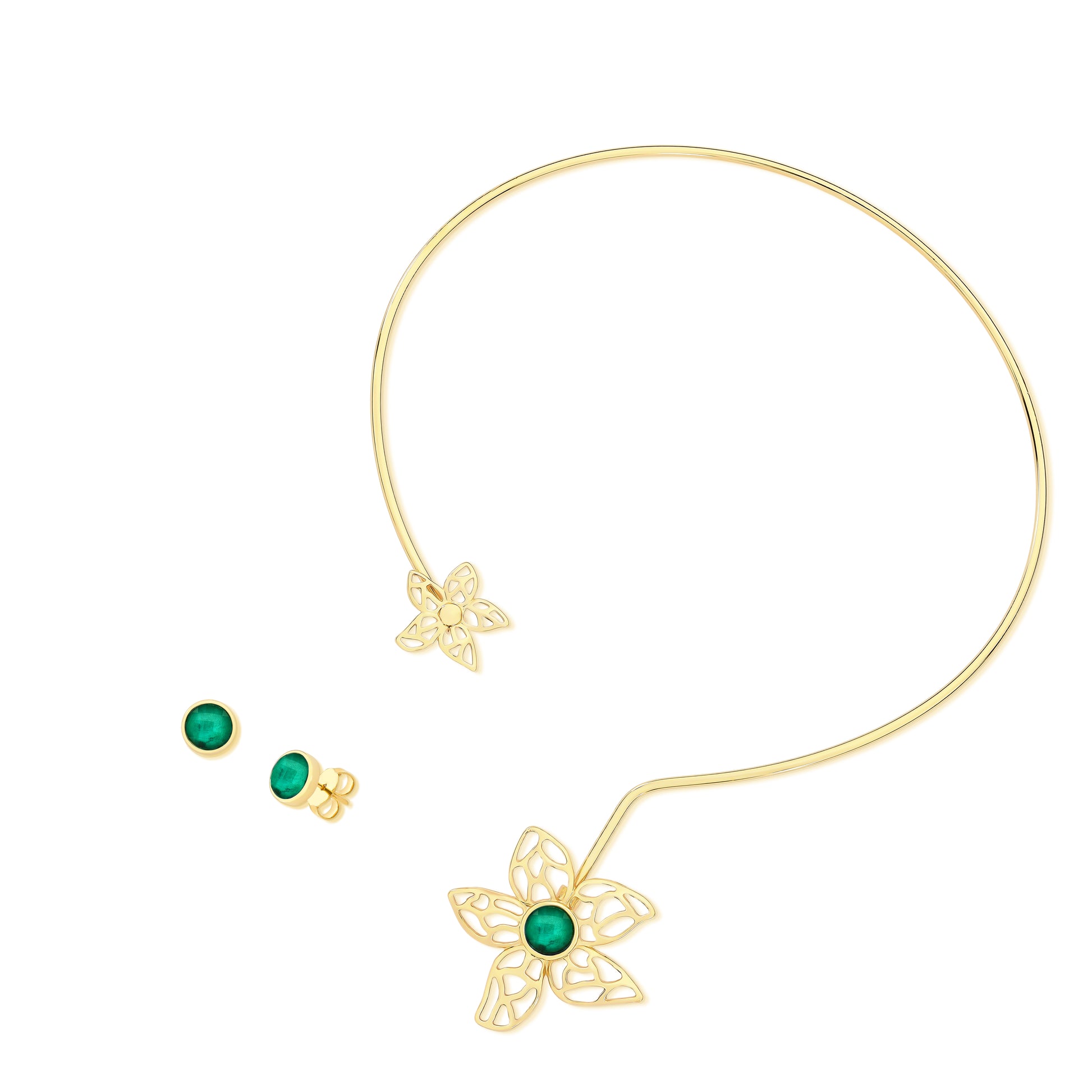 Ensemble raffiné composé d’un collier ras de cou et de boucles d’oreilles plaqués or. Le design délicat en forme de fleur aux pétales ajourés évoque légèreté et élégance, tandis que les pierres semi-précieuse Emeraude centrales ajoutent une touche de couleur et de luminosité. Un ensemble polyvalent et élégant, idéal pour sublimer des tenues modernes ou classiques.