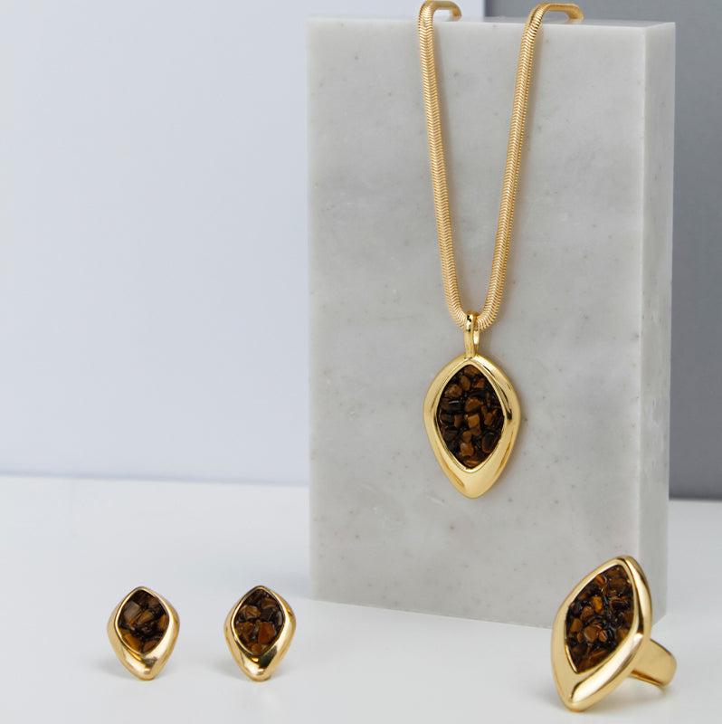 Élégant ensemble composé d’un collier et de boucles d’oreilles plaqués or. Le design met en valeur un pendentif et des boucles d’oreilles de forme organique, avec une finition polie qui entoure des pierres texturées, créant un contraste raffiné. La chaîne de type serpent apporte fluidité et modernité, faisant de cette pièce un choix idéal pour sublimer des looks classiques ou contemporains.