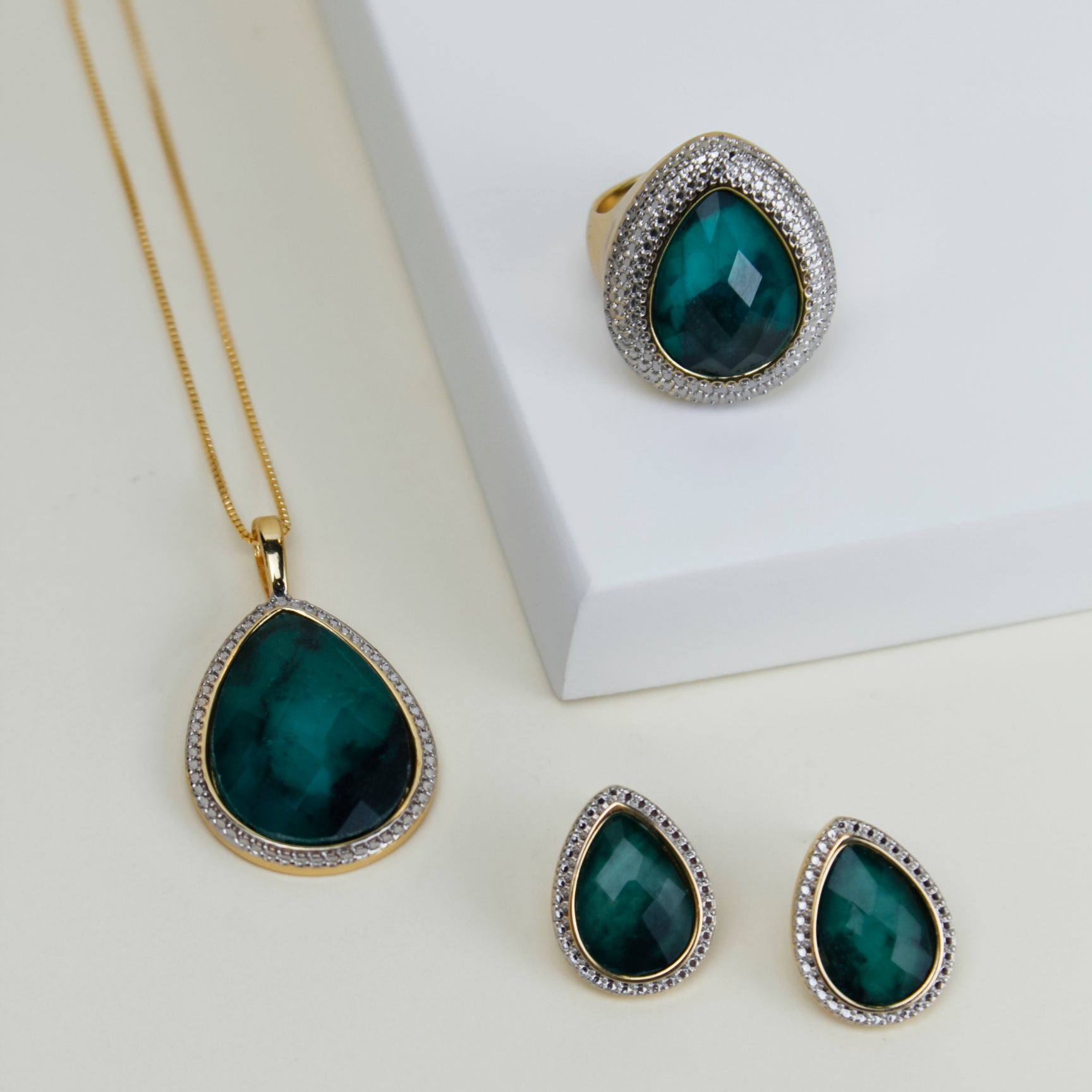 Ajoutez une touche de luxe et de sophistication à votre look avec cet ensemble éblouissant. Les pièces, avec leur design en goutte, présentent des pierres multifacettes qui affichent un éclat profond et captivant. Le contour de petits cristaux scintillants rehausse la beauté de la pierre, créant un contraste élégant avec la finition plaquée or. Parfait pour ceux qui recherchent un accessoire alliant glamour et intemporalité, cet ensemble est idéal pour les occasions spéciales.
