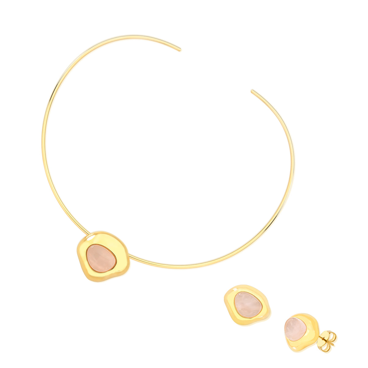 Cet ensemble de collier et boucles d'oreilles, plaqué or, présente un design moderne et élégant. Le collier, de style jonc ouvert, et les boucles d'oreilles clous sont ornés de pierres de forme irrégulière.