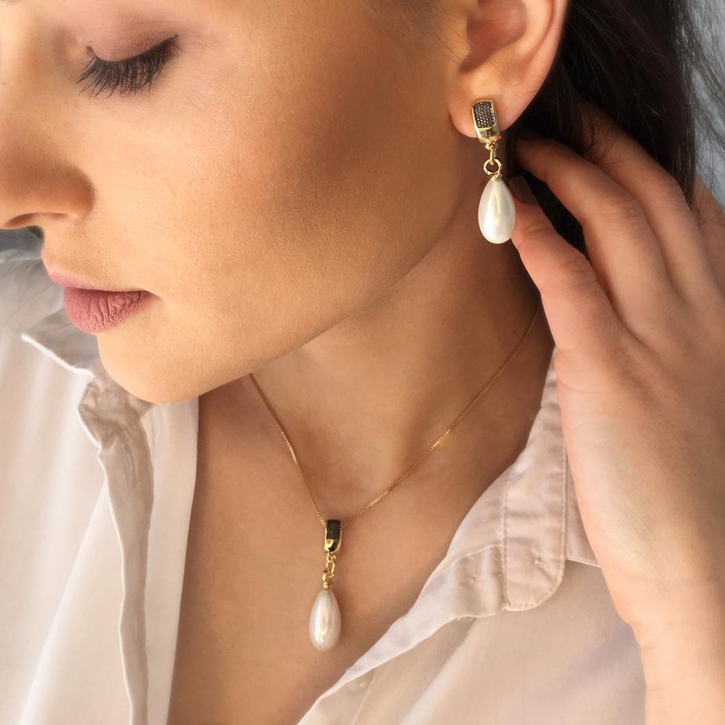 Parure plaquée or et rhodium noir avec perles en goutte